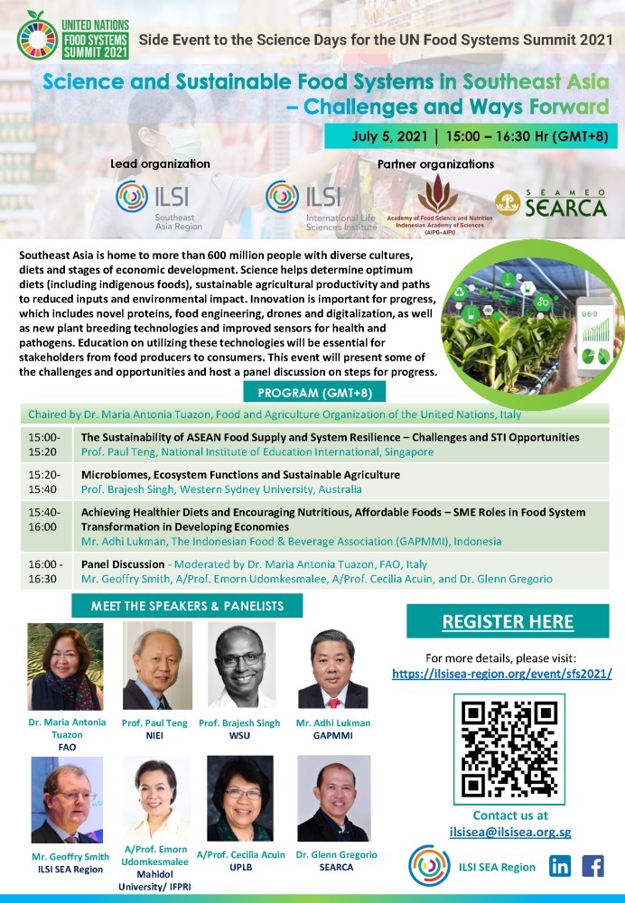 ILSI SEA Region, ILSI , AIPG AIPI, and Southeast Asian Regional Center for Graduate Study and Research in Agriculture (SEARCA) will be hosting a webinar: Science and Sustainable Food Systems in Southeast Asia - Challenges and Ways Forward, on July 5, 2021, 3:00 PM to 4:30 PM (GMT+8) in conjunction with the UN Food Systems Summit Science Days. The program, registration details and speakers & panelists' profiles are available at https://ilsisea-region.org/event/sfs2021/!
